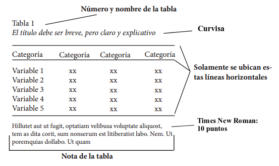 Nombre de la tabla: Es el título de la tabla, debe ser corto, simple y descriptivo. Se escribe en cursiva.